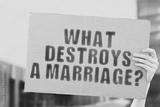 The phrase " What destroys a marriage? " on a banner in men's hand with blurred background. Family. Couple. Love. Relationship. Broke up. Crash. Failure
