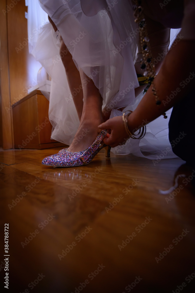 Mani che aiutano la sposa a calzare il sandalo con paillettes multicolori da cerimonia