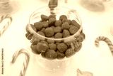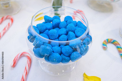 Coppa trasparente con dolciumi azzurri in primo piano sulla tavola allestita per la caramellata