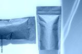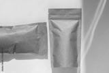 Brown kraft paper pouch bags with coffee beans top view with shadow isolated on white background. Packaging for foods and goods template mockup. Pack with clasp for tea leaves,weight products flat lay