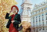 Happy, smiling fashionable woman wearing stylish autumn outfit: orange hat, dress, green velvet blazer, holding purple leather handbag, posing in street of Paris. Copy, empty space for text