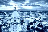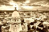 Aerial view of the Illinois State Capitol dome and Springfield skyline under a dramatic sunset. Springfield is the capital of the U.S. state of Illinois and the county seat of Sangamon County