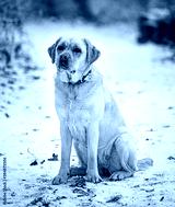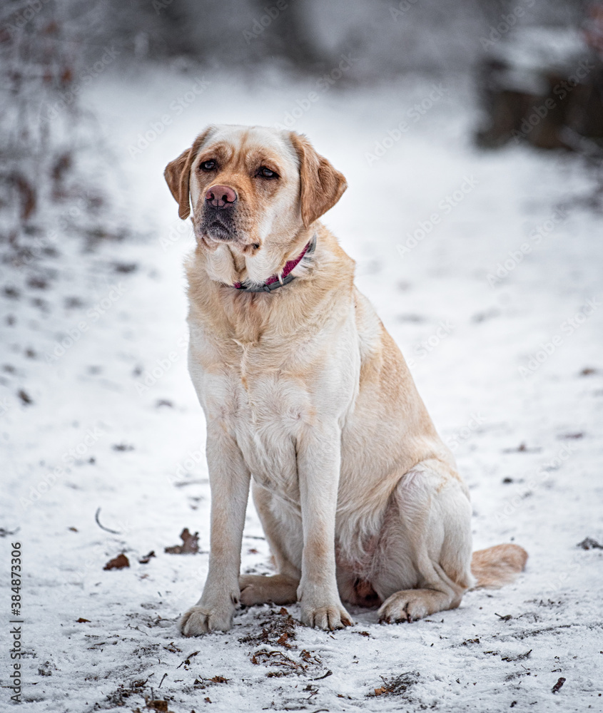 Nice labrador dog in the forest in winter