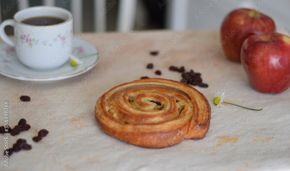 Freshly baked red apple and raisin roll for Sunday breakfast.