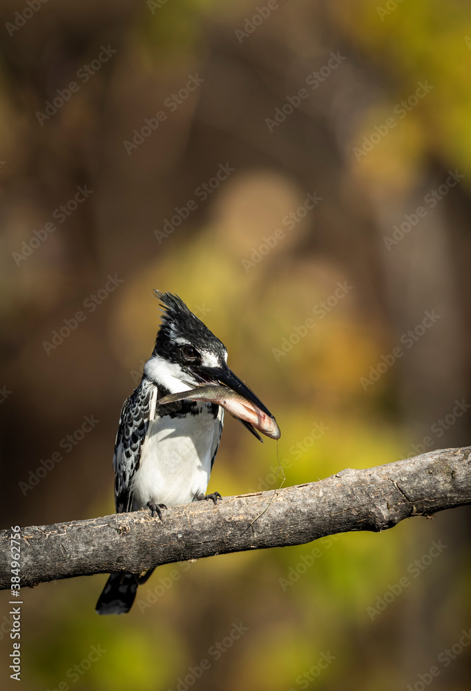 Pied kingfisher sitting on a tree branch with fish in its beak in Chobe River in Botswana