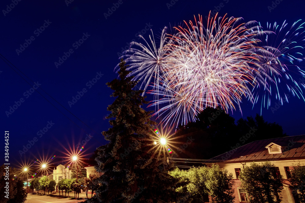 Colorful fireworks on background night sky. The explosions of salute from pyrotechnics at festival