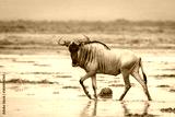 Adult eastern white bearded wildebeest walking in wet plains of Amboseli in Kenya