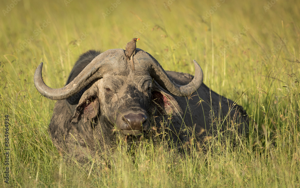 Buffalo bull lying in grass with red billed ox pecker on it's boss in Masai Mara in Kenya