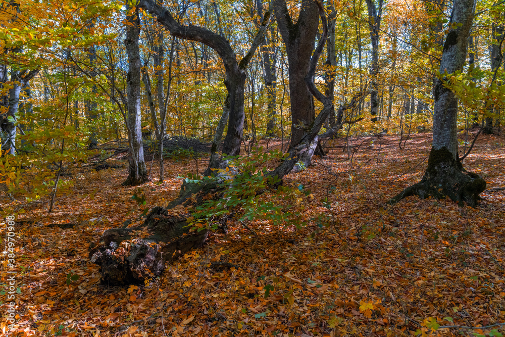 Autumn forest dry yellow leaves
