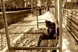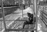 A boy sits on a bench at a transport stop and cries. The boy got lost and was left alone.
