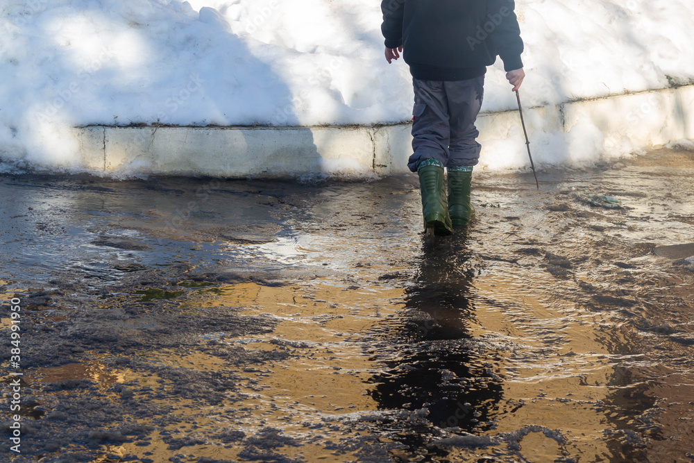 A boy runs along a stream in the spring. Warm clear Sunny weather outside. The snow is melting.