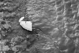 A ship made of foam with an orange leaf instead of a sail floats along the stream in the spring.