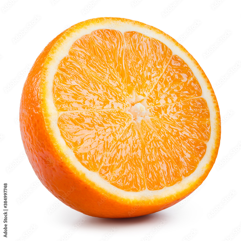Orange half isolated. Orange slice isolate. Orange fruit half on white. With clipping path. Full depth of field.