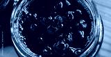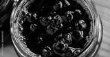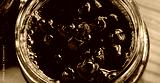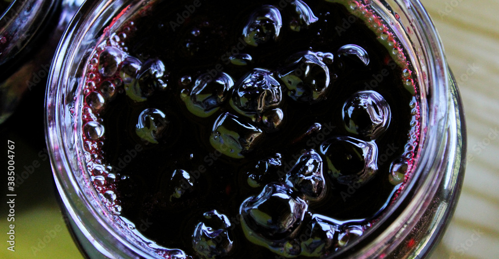 Banner of chokeberry jam in a glass jar. Sweet from aronia.