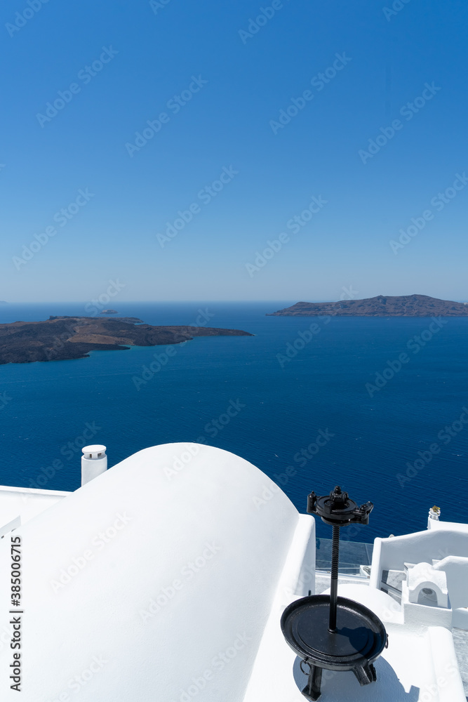 Old metallic tool for decoration on a white roof of a house of Santorini island, Greece. Blue Mediterranean sea and Santorini caldera in the background. Portrait format