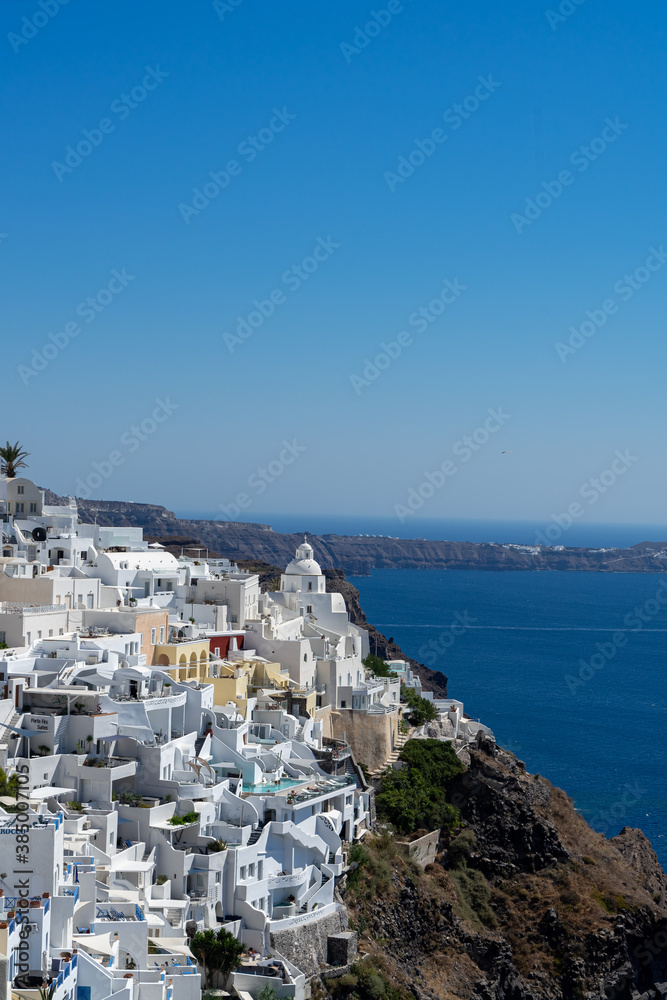 Panoramic view of Thira town in Santorini island with old whitewashed houses and typical orthodox church, Greece Greek landscape on a sunny day. Portrait format