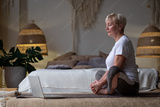 Middle age caucasian sportswoman sitting on mat with smile on face using laptop at home