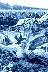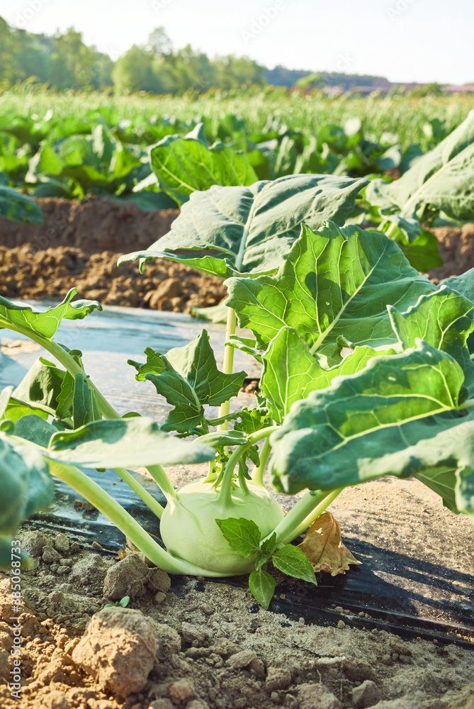 Close up picture of a young kohlrabi on organic farm field patch covered with plastic mulch, selective focus.