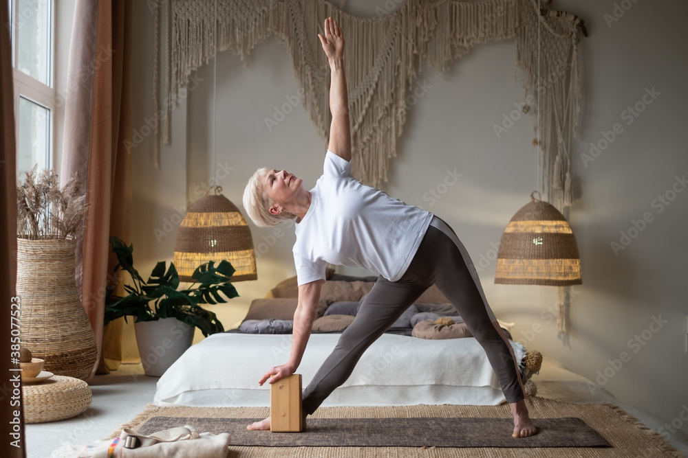 Senior woman practicing yoga, stretching in Utthita Trikonasana exercise, extended triangle pose