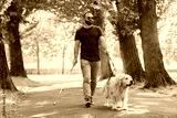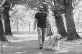 Guide dog helping blind man in the city. Handsome blind guy have rest with golden retriever in the city.