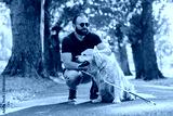 Guide dog helping blind man in the city. Handsome blind guy have rest with golden retriever in the city.