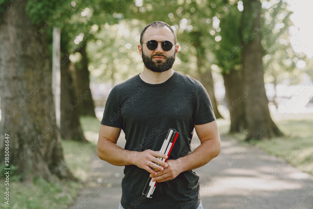 Blind man. People with disability, handicapped person and everyday life. Visually impaired man with walking stick, descending steps in city park.