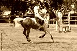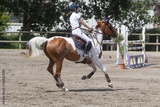 Woman riding a pinto horse at gallop
