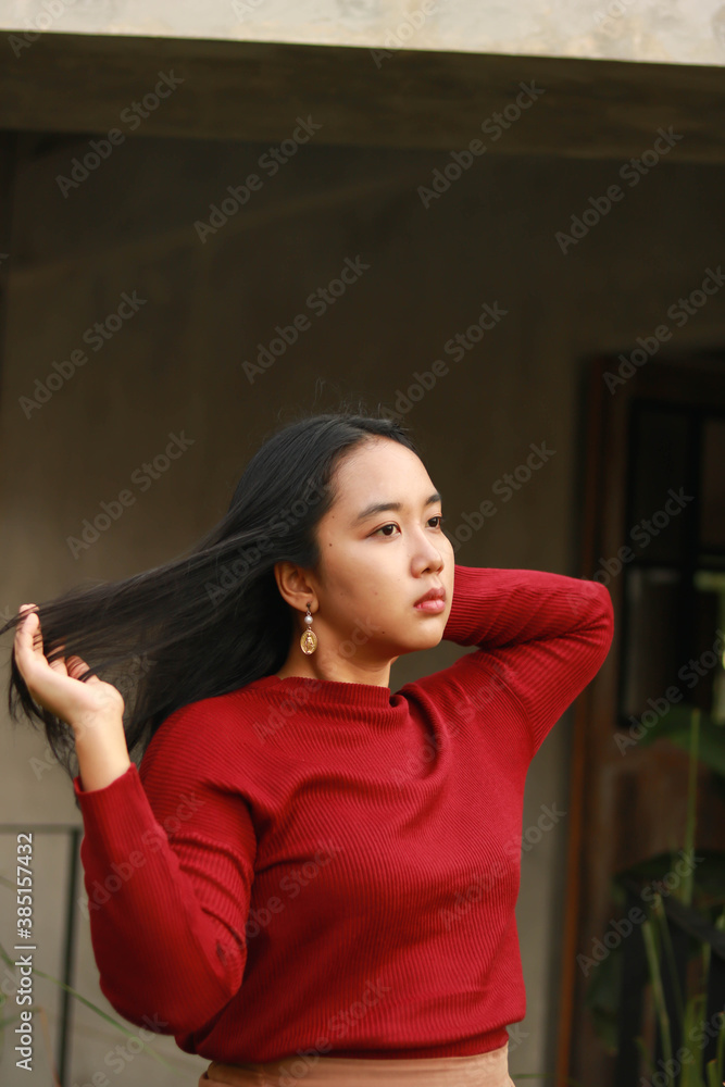 Young beautiful woman wearing red casual t-shirt.