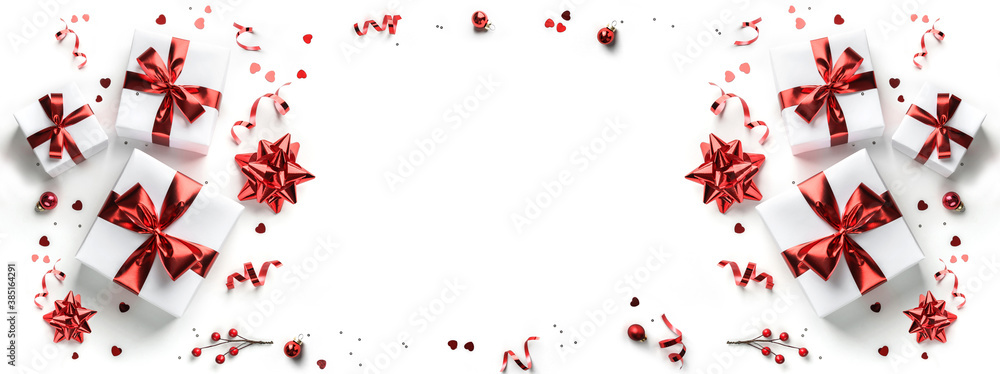 Merry Christmas card made of gift boxes, red decoration, sparkles and confetti on white background. Xmas and New Year holiday, bokeh, light. Flat lay, top view, wide composition