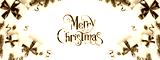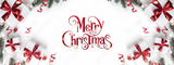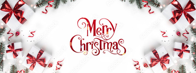 Merry Christmas text on white background with gift boxes, ribbons, red decoration, fir branches, bokeh, sparkles and confetti. Xmas and New Year greeting card, bokeh, light. Flat lay, top view