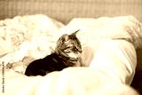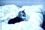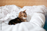 Beautiful pet cat lying on a bed in bedroom at home. Relaxing fluffy hairy striped domestic animal with green eyes. Adorable furry kitten feline friend.