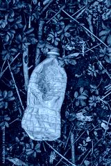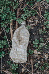 Old aged plastic bottle garbage on ground in green grass. Trash litter dump in a forest park. Ecological environmental world nature problem concept. Protection and saving of nature.