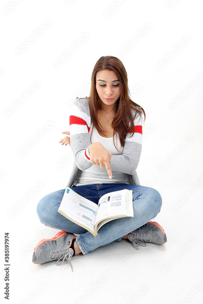 Yong Asian youth girl in casual dress sit on floor book on lap point finger down expression think idea on white background