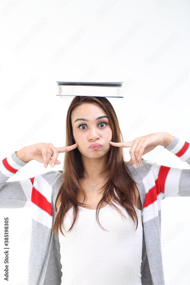 Yong Asian youth girl in casual dress balancing book on head look at camera finger on cheek expression mouth blown funny face on white background