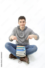 Middle eastern Caucasian young in casual dress sit on floor pointing at books happy smile expression on white background