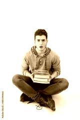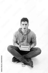 Middle eastern Caucasian young in casual dress sit on floor holding heavy books annoyed surprised expression on white background