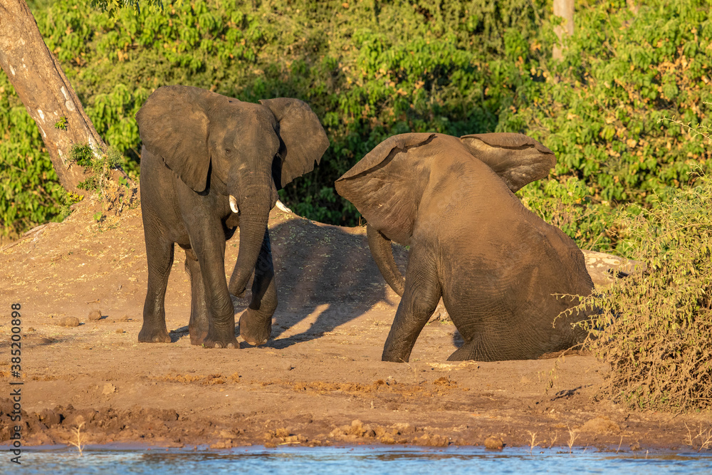 Two young elephant bulls play fighting at the edge of Chober River in Botswana