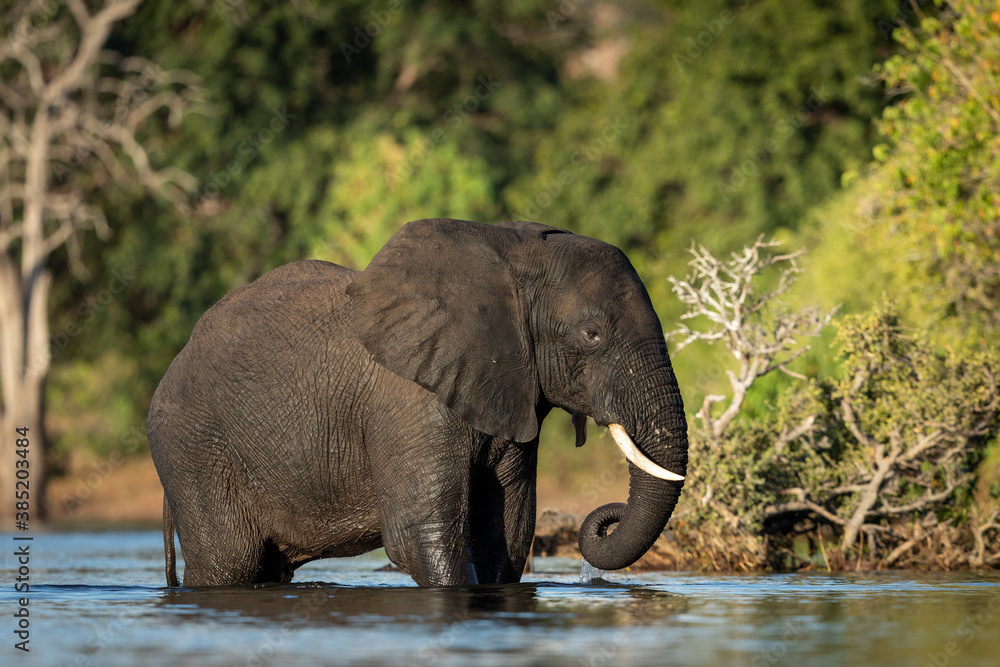 Young elephant standing in shallow water in Chobe River in afternoon sunlight in Botswana