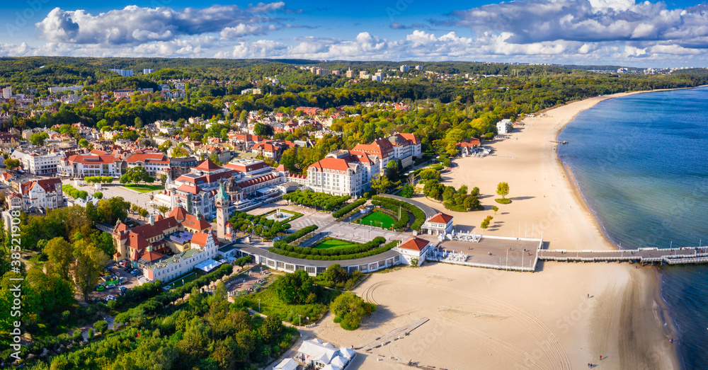 The sunny scenery of Sopot city and Molo - pier on the Baltic Sea. Poland
