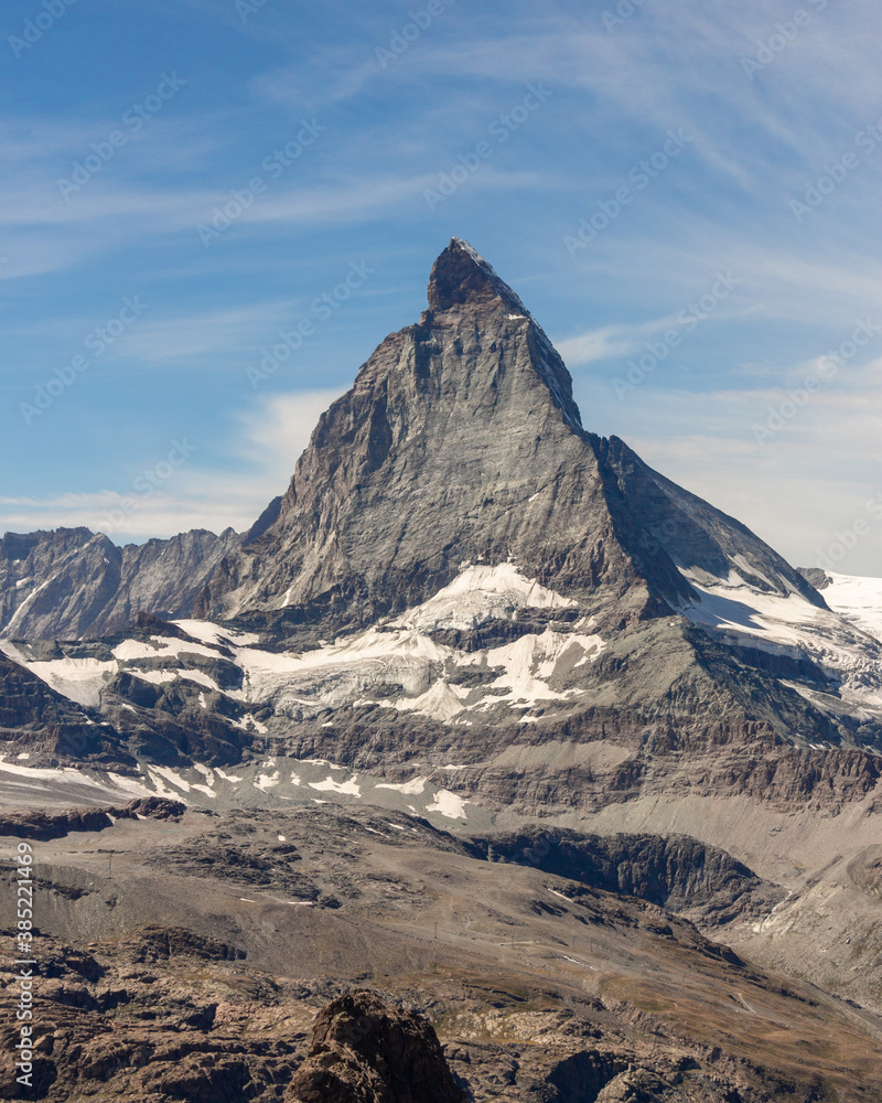 Matterhorn Mountain with white snow and blue sky in summer in Switzerland