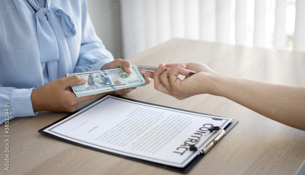 Businessmen give dollars to bribe employees in signing contracts to buy illegal land and real estate, Business fraud and social injustice, corruption and bribery concept.
