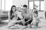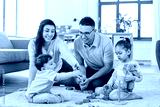 family and people concept - happy mother, father, little daughter and baby son playing with wooden toys at home