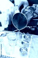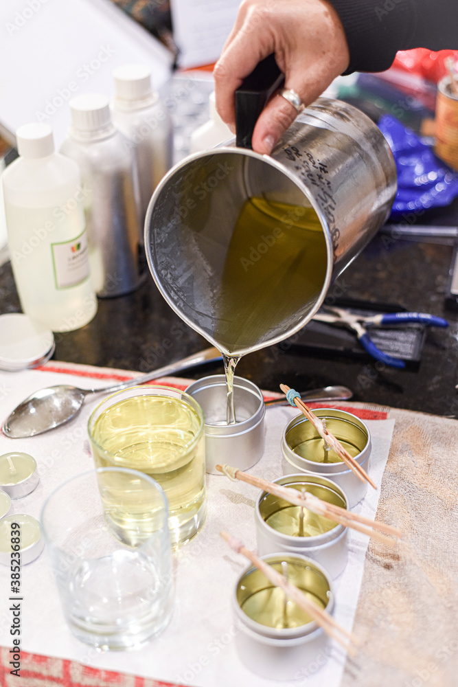 Creative occupation of candle making showing the pouring of liquid wax into jars