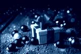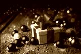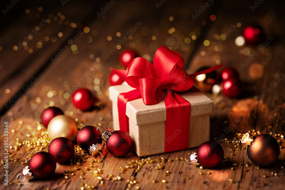 Christmas gift box with red bow and Christmas tree ball ornaments on rustic wood - Xmas decoration with copy space