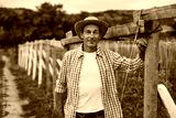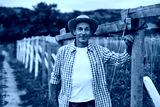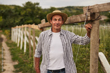 Mature farmer standing near fence in countryside