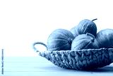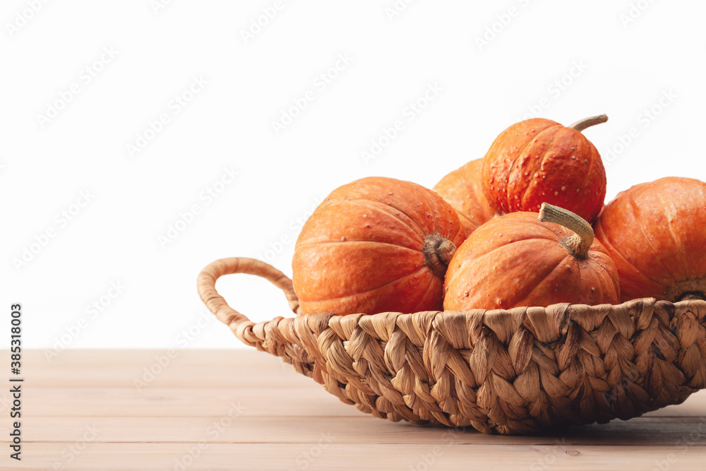 Orange round pumpkins in wicker basket on light wooden table. Copy space. Happy Halloween.
