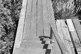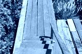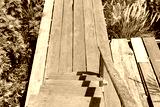 Old wooden bridge in the yellow cosmos flower field