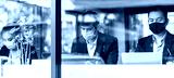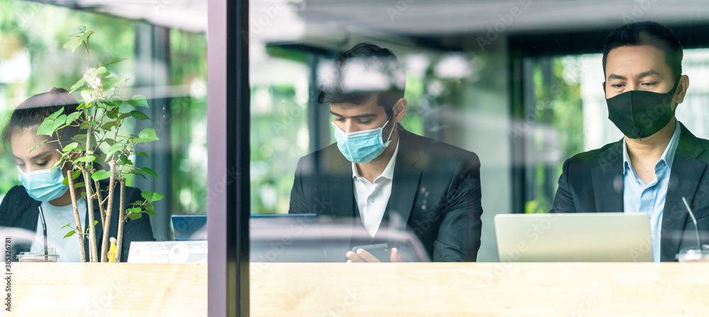 new normal lifestyle concept business people wearing mask sit with social distancing working in public area or co working space with laptop and smartphone