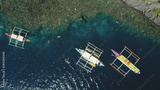 Top down of boats at green mount ocean coast aerial view. Epic summer landscape with vessels at rock shore. Nature beauty of tropic mountain isle Palawan, El Nido Islands, Philippines, Asia.