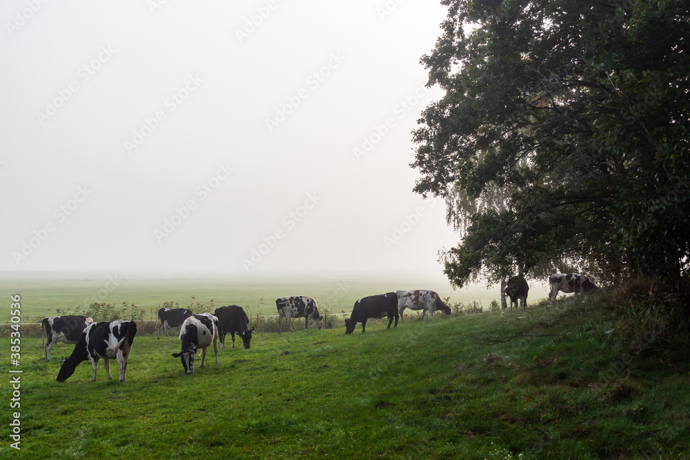 Jesienny krajobraz Doliny Narwi spowity mgłą, Podlasie, Polska